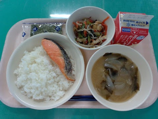 今日の給食「ごはん 焼きのり さけの塩焼き 煮びたし みそ汁 牛乳」