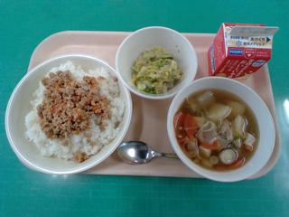 今日の給食「そぼろごはん 塩だれキャベツ けんちん汁 牛乳」