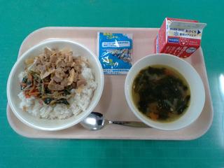 今日の給食 「ビビンバ(麦ごはん) わかめとコーンのスープ ミニフィッシュ 牛乳」