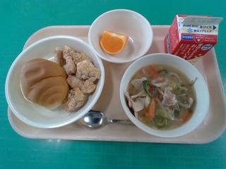今年度最後の給食 「ロールパン とり肉のから揚げ みそワンタンスープ せとか 牛乳」