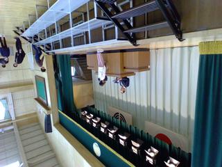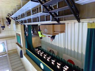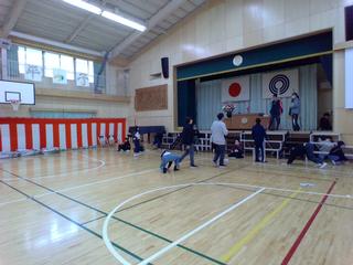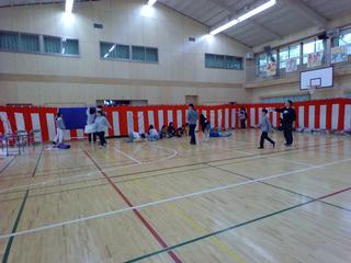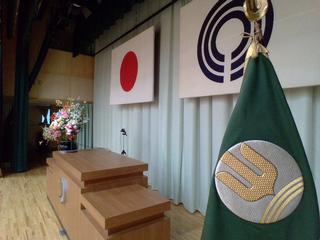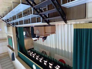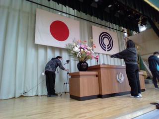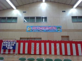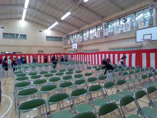 50周年のスローガンも前日にアリーナ後部に取り付けました。