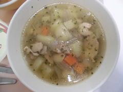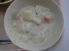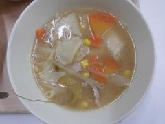 3月16日 月曜日(むぎごはん、チキンストロガノフ、キャベツのスープに、ピーチゼリー、ぎゅうにゅう)