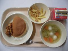 3月6日 金曜日(ビーンズサンド、じゃがいものからあげ、コンソメスープ、ぎゅうにゅう)