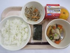 11月6日 木曜日(ごはん、やきのり、さつまあげとふゆやさいのにもの、もやしいため、みかん、ぎゅうにゅう)