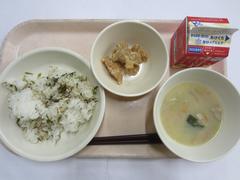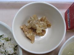 11月25日 火曜日(ごはん、だいこんばのふりかけ、とりにくのからあげ、とうにゅうちゅうかスープ、ぎゅうにゅう)