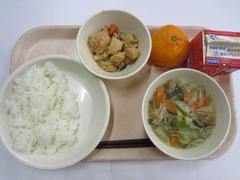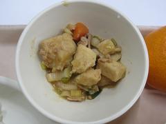 12月3日 水曜日(ごはん、ぶたにくとなまあげのいために、やさいスープ、みかん、ぎゅうにゅう)