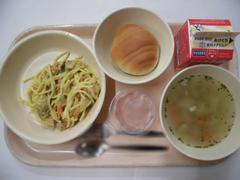 2月20日 金曜日(ミニロールパン、カレークリームスパゲッティ、ベジタブルスープ、ピーチゼリー、ぎゅうにゅう)