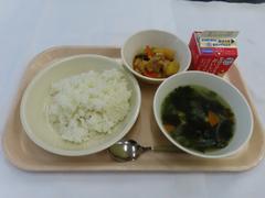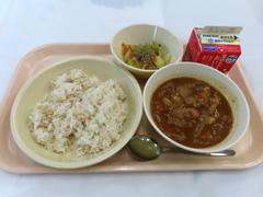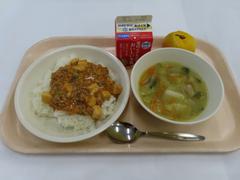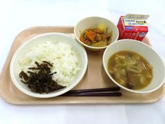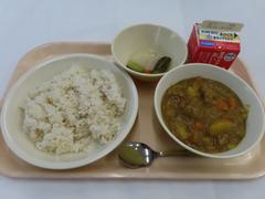 麦ごはん、大豆ミートのドライカレー、キャベツとじゃこの炒め煮、牛乳