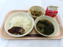 ごはん、茎わかめのつくだ煮、肉じゃが、みそ汁、牛乳