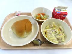 ロールパン、さつま芋のグラタン、ボイル野菜、和風ドレッシング、牛乳