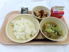 ごはん、焼きのり、とり肉のおろしソース、野菜スープ、牛乳