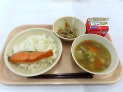 ごはん、さけの塩焼き、もやし炒め、けんちん汁、牛乳
