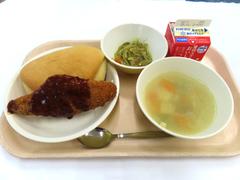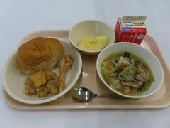 胚芽ロールパン、とり肉のから揚げ、ワンタンスープ、りんご、牛乳