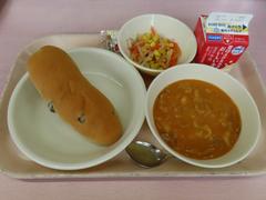 白パン、いちごジャム、豚肉のトマト煮、ベジタブルスープ、牛乳