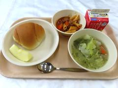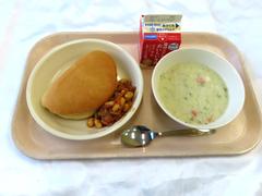 ビーンズサンド(サンドパン・ビーンズ)、長ねぎのポタージュ、牛乳