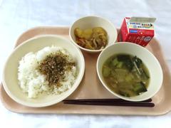 ごはん、ふりかけ、肉じゃが、みそ汁、牛乳