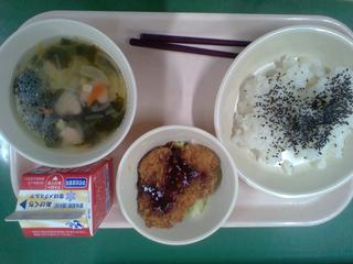 献立は、とんかつ、ボイルキャベツ、能登の塩で作ったごましお、能登のお米のご飯、わかめとコーンのスープ(ハート型のかまぼこ入り)、牛乳です。