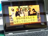 6年生は家庭科で栄養について学び、学校栄養士からも給食の献立作りについて教えてもらいました。そして、それを生かして、給食の献立案を考えました。6年生132人全員が、学校給食にふさわしく、体のためにもいいと思えるものを考えました。これらの案は、社会科の主権者教育で行う模擬投票のテーマとして取り上げ、当選したものが2月の自校献立になる予定です。132の献立から6年生で9つに絞り、それらの献立を新たにアピールし合って模擬投票を行います。模擬投票は6年生のみですが、自校献立は全校で決めたいとの思いから、GIGA端末を使って、投票を呼びかけました。どの献立が選ばれ、みんなで食べることができるのか楽しみです。