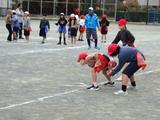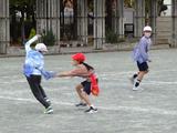 4年生が講師を招いて体育でフラッグフットボールの学習を行いました。フラッグフットボールは、アメリカンフットボールを簡略化したようなゲームで、腰に付けたフラッグを取られないように動き方を考えながらボールをエンドラインまで運んでいきます。。講師の方に基本的なルールや動き方を教わったあと、実際に3対2でゲームを行いました。守りをかわすためにチームでどう動くかが大切になります。順番を待っている間には「近くにいるときはパスは弱めね」「相手はここにいるから、こっちに走ろう」と友達と話し合う姿が見られました。