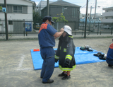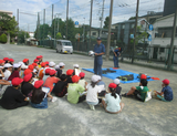 子どもたちは防火服を着たり、重いホースを協力して伸ばしたりしました。