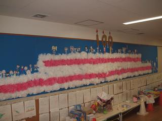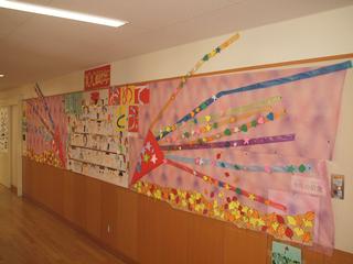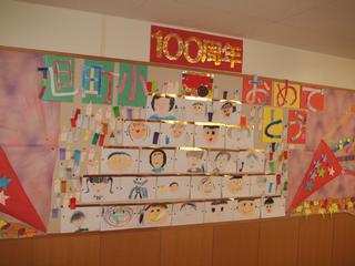 今日は、明日の式典に向けた前日準備。各学年の出し物の練習も最後となりました。教室や廊下には、ご来校くださった皆様を温かく迎え入れるために考えられた、数々の掲示物や展示物が用意されています。エレベーターホールには、過去の木造の校舎が現れました。また、廊下には・・・・