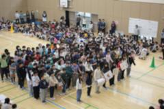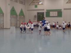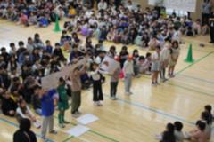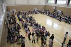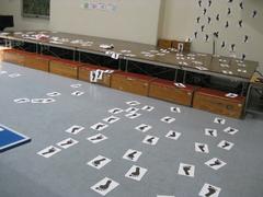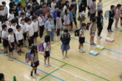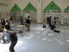 時間がたつにつれ、子どもたちの動きもダイナミックに、そして、足跡がいっぱい!並べ終わったあとに、グループごとに発表し、みんなで楽しみました。多目的ホールは吹き抜けになっているので、3階から見ることができます。上から見て感想を伝え合っていました。他の学年も「何をしているんだろう」と興味津々でした。