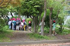 校庭では、2年生が「春探し」をしていました。何か生き物でも見つけたのでしょうか?