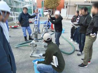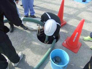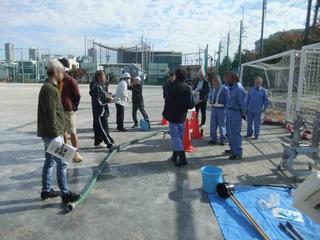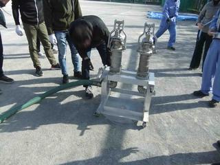 こちらは、応急給水拠点設備の組立訓練。川崎市上下水道局の職員から説明を受けながら、校庭に埋まっている貯水槽から水を汲み上げてみました。
