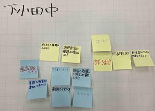 井田小学校、下小田中小学校、住吉小学校の児童が、学校ごとにグループになり、中学生になるうえで心配なことや楽しみなことを付箋に書いてもらいました。各グループに井田中学校の生徒も加わり、小学生から出た意見について回答していきました。
