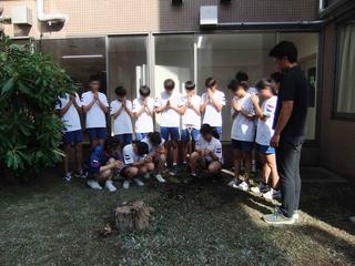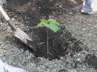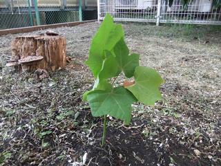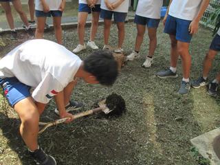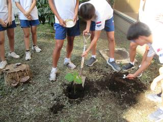 8月27日(水)、3年生が修学旅行で広島市からいただいた「あおぎり」を鉢から学校の敷地に植樹しました。