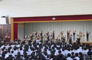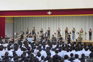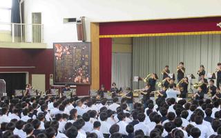トリは吹奏楽部。MCでは寸劇で先生方も登場。