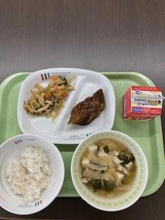 今日の給食は、「煮びたし、あじのカレー揚げ、大根のとろみ汁、麦ごはん、牛乳」です。