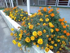 体育館前のマリーゴールドの花が夏からより大きくなり大輪の花を咲かせています。