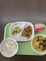 今日の給食は、「塩だれ野菜、豚肉の黒こしょう炒め、かきたまスープ、麦ごはん、牛乳」