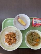 8日(月)マーボー丼(麦ごはん)、野菜スープ、りんご、牛乳