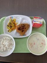 11日(木)野菜ソテー、かつおフライ、中濃ソース、クリームスープ、ご飯、牛乳