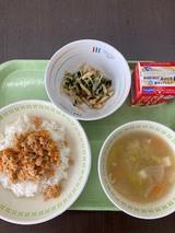 今日の給食は、「おひたし、つなそぼろごはん、具だくさんちゃんこなべ風スープ、牛乳」です。