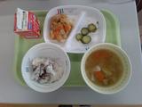 今日の給食は、「ごまきゅうり、肉じゃが、赤しそふりかけ、すいとん、麦ごはん、牛乳」です。