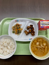 今日の給食は、「磯香あえ、ぶりの塩こうじから揚げ、麦ごはん、とうがんのみそ汁、牛乳」でした。