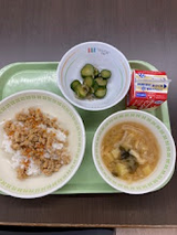 今日の給食は、「高野豆腐のそぼろごはん(麦ごはん)、じゃが芋のみそ汁、じゃこきゅうり、牛乳」です。