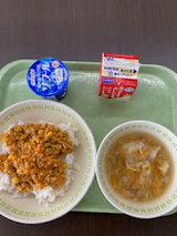 今日の給食は、「大豆ミートのドライカレー、麦ごはん、ジュリエンヌスープ、ヨーグルト、牛乳」でした。