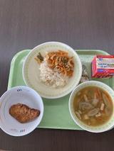 今日の給食は「かれいのたつた揚げ、こぎつねごはん(しょうゆごはん)、芋煮汁、月見団子、牛乳」と十五夜にちなんでおり、秋を感じる献立でした。(配膳の位置が違っておりすみません)