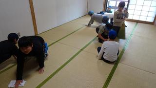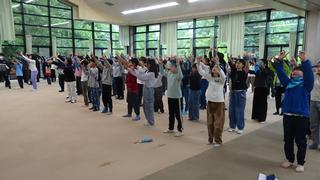 雨のため、室内での朝の集いとなりましたが、体操で体を動かします。