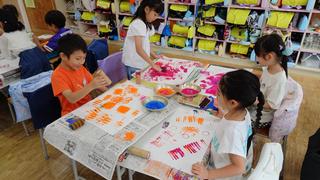 スポンジローラーやトイレットペーパーの芯、緩衝材などに絵の具をつけて、様々な色や形を紙に写し出す造形活動を楽しんでいました。