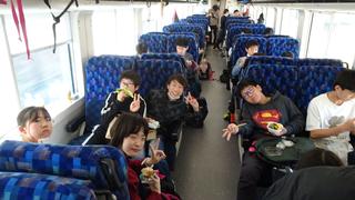 車内で出発式を行い、修学旅行のスローガンをみんなで確かめました。
