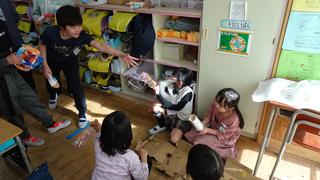 1年生は、等々力緑地やこどもの国で集めてきたどんぐりやまつぼっくりを使って、輪投げやけん玉などを作り、様々な遊びのコーナーを用意しました。