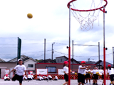 校庭に並べたリングに向かってシュートをした子ども達、汗びっしょりになりながら「楽しかった!」と笑顔を見せていました。