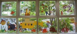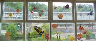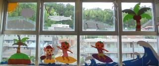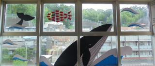 装飾ボランティアの皆さまが、暑い夏にぴったりの涼しさを感じる装飾を校内に施してくださいました。深海から海中、海面、そして空へと階を上がるごとに風景が変わる楽しい仕掛けになっています。なんと、校門前からもこの作品が見えるのです!地域の方にも少しでも涼しさを感じていただければ嬉しいです。実は、私(校長)と教頭、教務主任も作品の中に登場しています。どこにいるか是非探してみてください。装飾ボランティアの皆さま、心のこもった素晴らしい作品をありがとうございました。