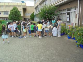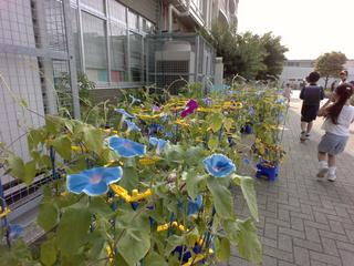 先日、テレビで入谷の朝顔まつりの様子を見ました。江戸時代から続くという伝統あるお祭りにはたくさんの朝顔が並び、訪れる人々が花を選ぶ姿が印象的でした。本校のグリーンゾーンでも、今年もたくさんの朝顔が見事に咲いています。青や紫、ピンクなど、色とりどりの花々が涼やかに風に揺れています。また、暑さ対策として用務員がミストシャワーをグリーンゾーンに移設してくれました。朝顔のそばを通るとやさしい霧がふんわりと降り注ぎ、子供たちに涼を届けてくれています。