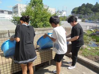 今日は今年度最後の水泳学習が行われました。青い空と白い雲の下、5年生が「着衣水泳」に取り組み、服を着たまま水に入ることで万が一の水難事故を想定した大切な体験をしました。子供たちは衣服が水を含んで動きにくくなることを身をもって感じながら、ペットボトルを使って身体を浮かせる方法も学びました。「本当だ!浮いてる」「足を広げるといいよ!」という声も聞かれ、命を守る術をしっかりと学んだようです。また、今年度もプールボランティアの皆様のご協力のおかげで、大きな事故もなく全ての水泳学習を無事に終えることができました。プールの衛生管理や子供たちの安全確保、さらには最後の片付けまでお力添えをいただき、本当にありがとうございました。連日の暑さの中、子供たちの安全のためにご尽力いただいたボランティアの皆様に心より感謝申し上げます。